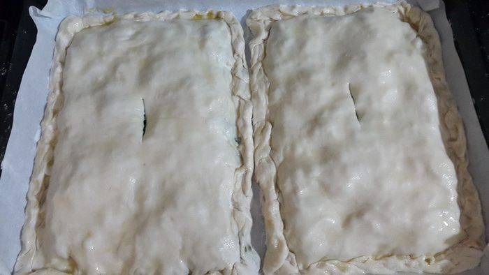 Раскатываем оставшиеся 2 пласта теста и накрываем наши пироги. Защипываем края, по центру делаем небольшие надрезы для выхода пара. Смазываем сверху оливковым маслом и отправляем запекаться в духовку на 200С до румяной корочки, примерно на 20-25 минут.
