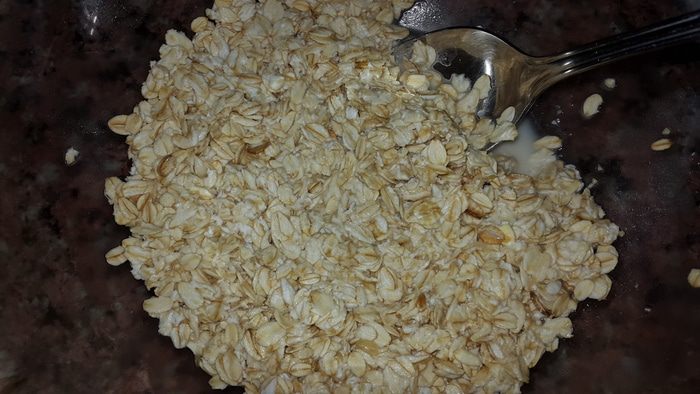 Овсяные хлопья заливаем небольшим количеством теплой воды, перемешиваем и отставляем в сторону.
