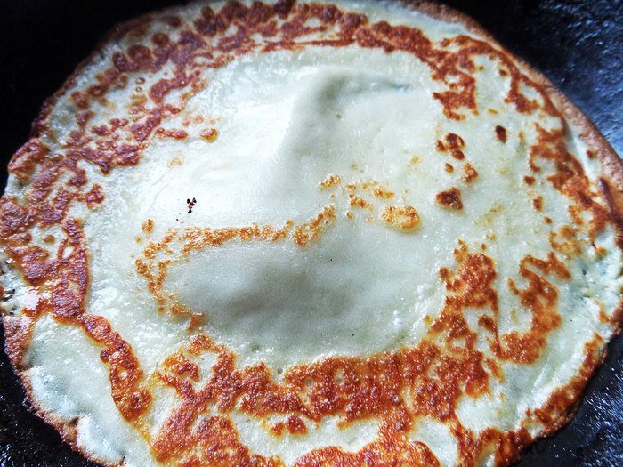 Тесто смешиваем блендером и наливаем понемногу тонко в прогретую сковороду, капнув немного масла. Жарим все блинчики.