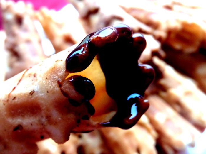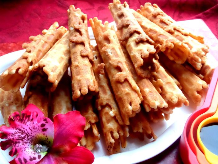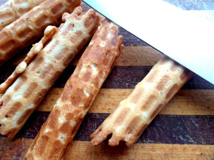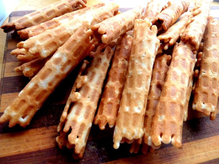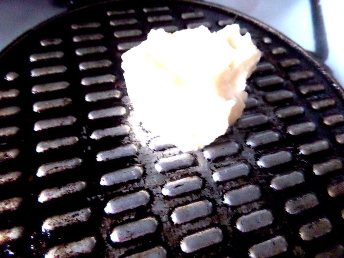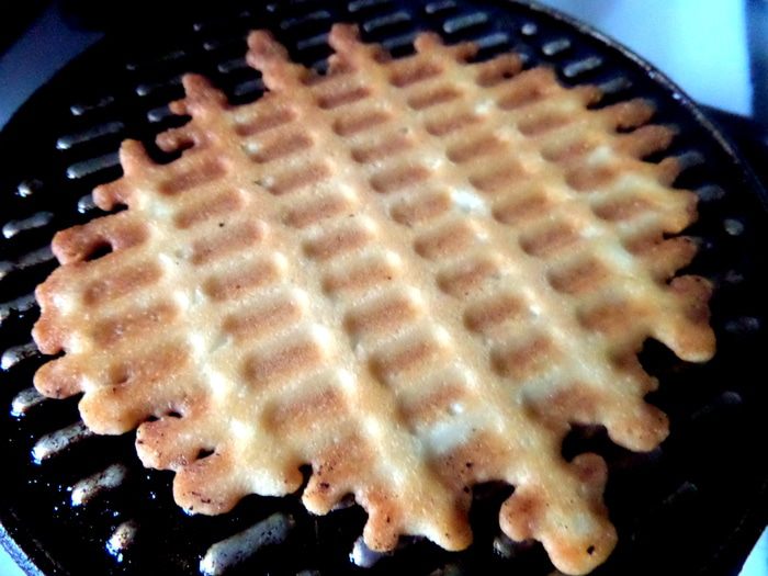 Разогреваем обе стороны вафельницы на газу, смазываем маслом при помощи силиконовой кисточки (тоже обе!) и кладём в центр раскалённой половинки ложку теста. Сразу же прижимаем, держим рукой плотно, потом отпускаем и жарим с двух сторон. Постоянно приоткрываем и проверяем, чтобы не подгорели!
