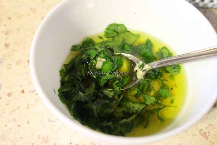 Для заправки смешать масло, мед, сок лимона, посолить и поперчить. Чеснок натереть на мелкой терке, кинзу мелко нарезать. Соединить все вместе и хорошо перемешать.