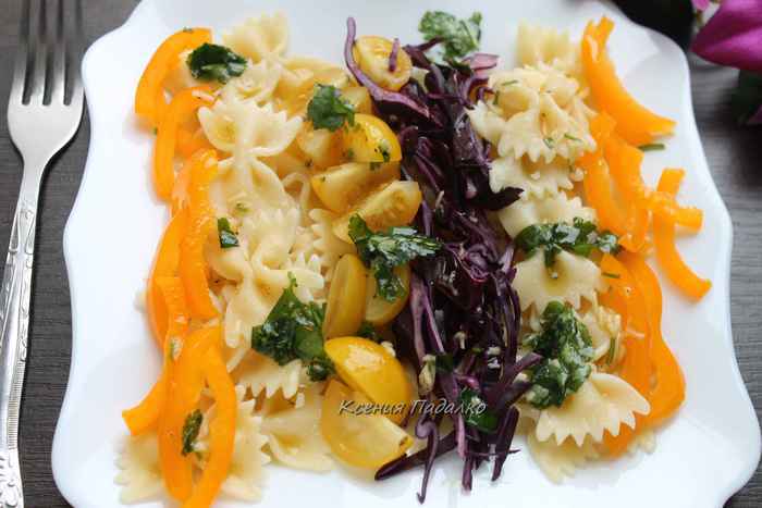 На тарелку выкладываем слой готовой пасты, сверху слегка поливаем заправкой. Сверху пасты кладем овощи в виде "дорожки" чередуя их и опять поливаем заправкой.
