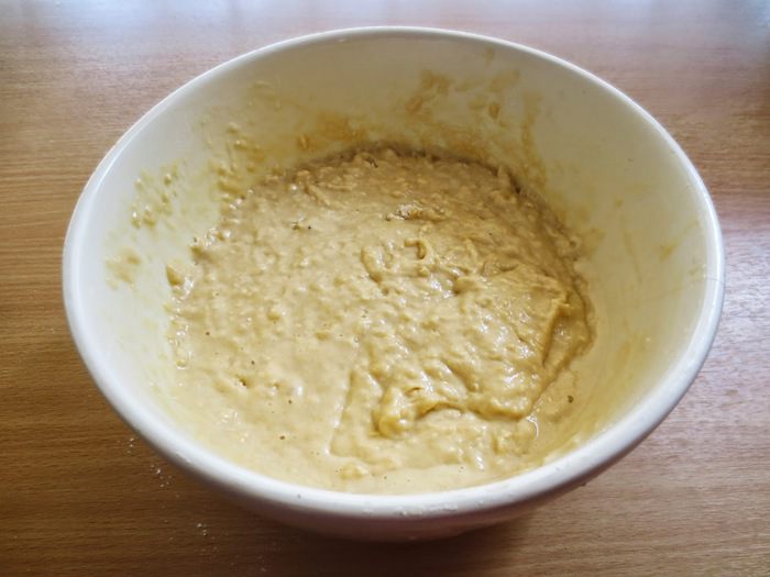 Смешиваем опару с яично-масляной смесью и постепенно соединяем с мукой