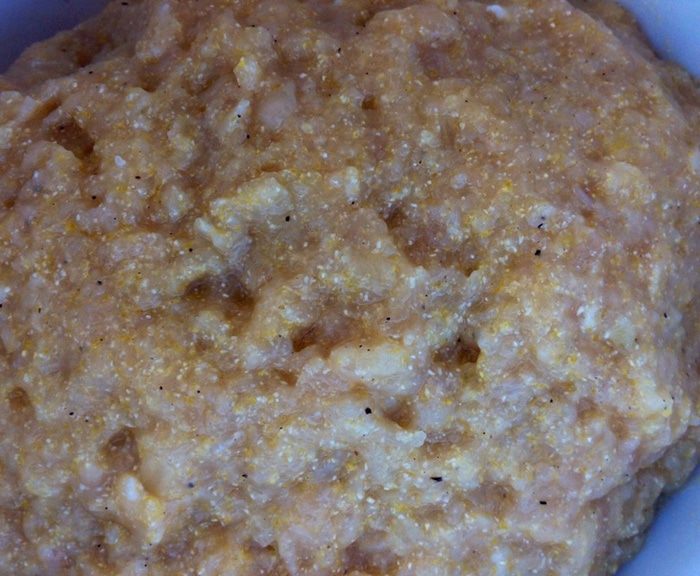 В куриный фарш добавляем 1 яйцо и 2 ст. ложки кукурузной муки, формируем руками фрикадельки и бросаем в кипящую воду.