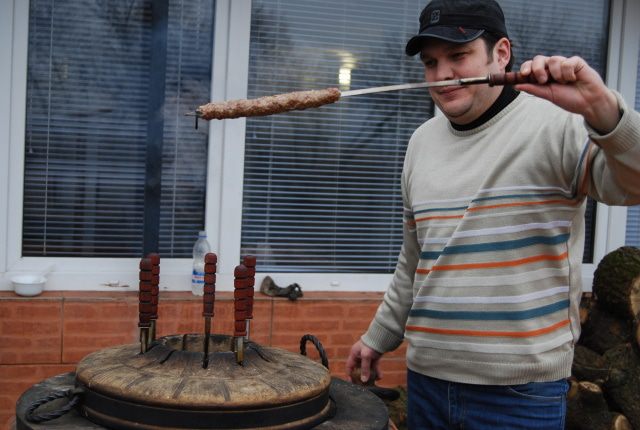 Формируем из фарша шарики где-то с кулак (котлетка) и нанизываем на шампур постоянно рукой разминая фарш вокруг шампура, при этом шампур вращая. Идея сформировать сардельку так, чтобы вышел весь воздух внутри и мясо плотно облегало шампур. Чтобы мясо легко формировалось в руке и не прилипало - смачиваем руки в теплой воде. Можно немного приплюснуть готовую сардельку (постараться, чтобы много мяса по бокам не свисало), кончики подкрутить. Итак на шампур помещается обычно две такие сформированные "сардельки".