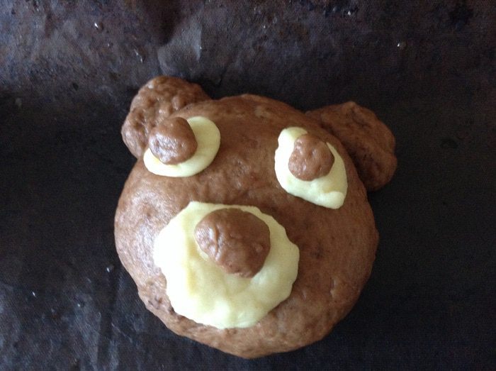Разделить тесто на 6 равных частей, из каждой части сформировать голову, в центр которой положить кусочек шоколада. Приделать ушки, мордочку и глазки (места крепления смазать молоком или яйцом).