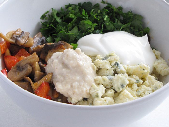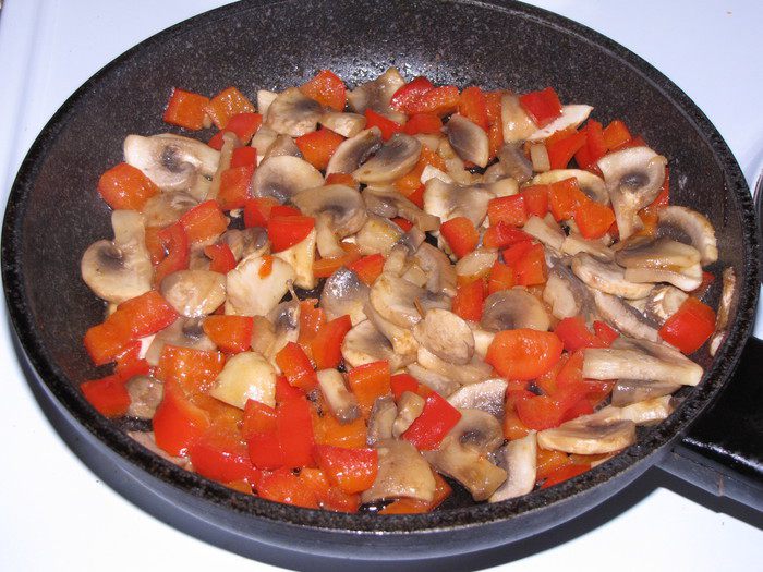 Грибы нарезать ломтиками, болгарский перец кубиками. Обжарить на смеси сливочного и растительного масла. Остудить.