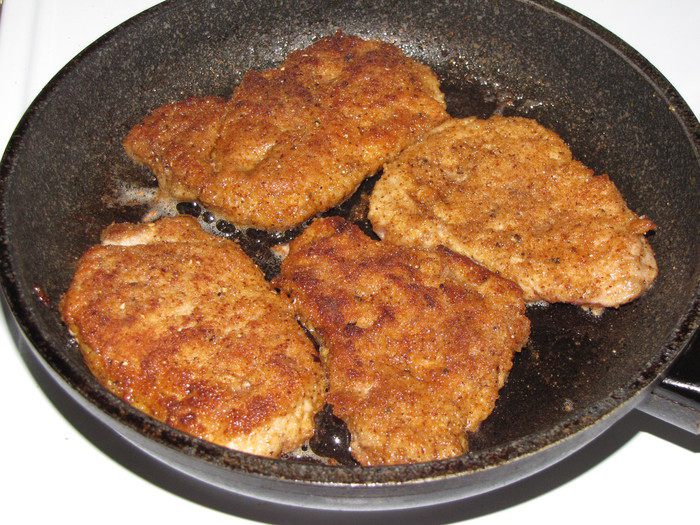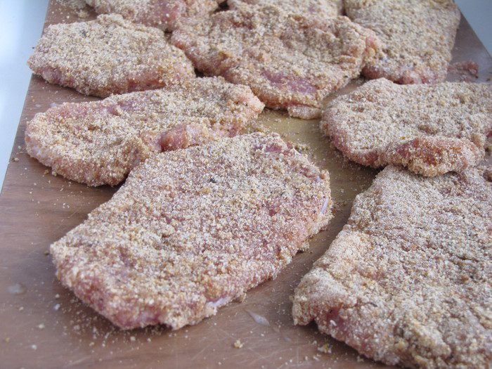 Нарезать мясо ломтиками толщиной 1 см и слегка отбить. Взбить яйцо с 1 ст. л. холодной воды. Обмакнуть каждый кусочек мяса в яйце, а затем обвалять в сухарях.