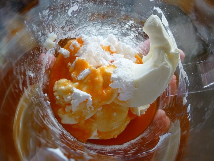 Взбиваем миксером творожный сыр с сахарной пудрой и тыквенным соком. Сока нам будет достаточно 2 ст.л, у меня после отжима тыквы именно столько и остается.