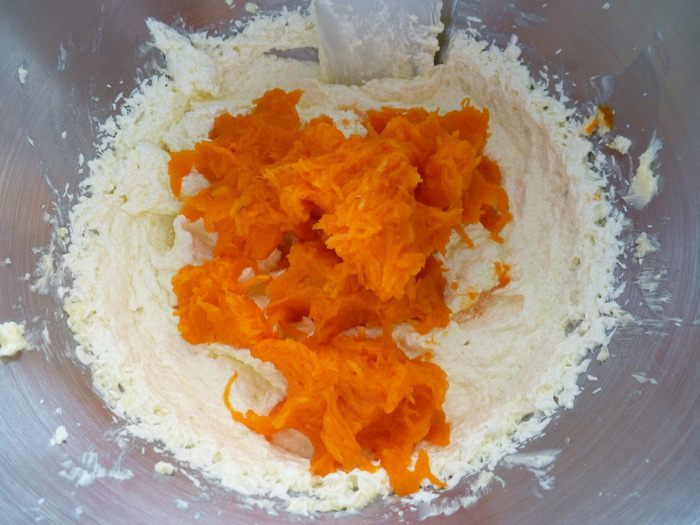 Отжимаем тыкву и добавляем в тесто. Отжатый сок сохраняем, он нам пригодится для сливочной шапочки!