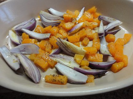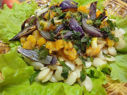 На тарелку с листьями салата выложить фасоль, полить соусом. Сверху выложить запеченные овощи, рубленый базилик и сбрызнуть оливковым маслом.