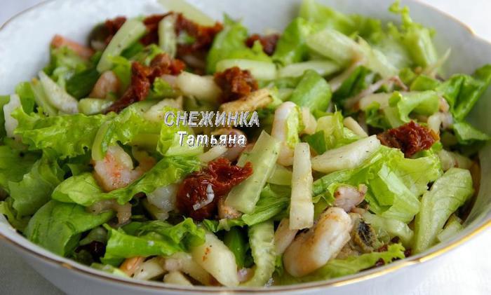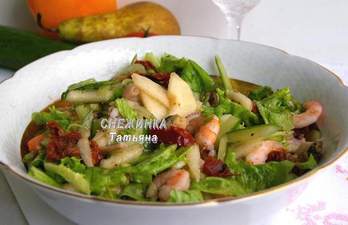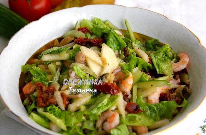 Салат из морепродуктов с грушей и вялеными томатами