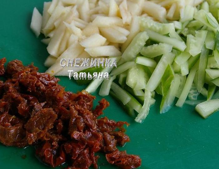 Вяленые помидорки промокните бумажным полотенцем от лишнего масла, нарежьте кусочками. Огурец вымойте, нарежьте соломкой. Грушу очистите от кожицы и также нарежьте соломкой, сбрызните лимонным соком. Грушу желательно брать твёрдую и достаточно сладкую.