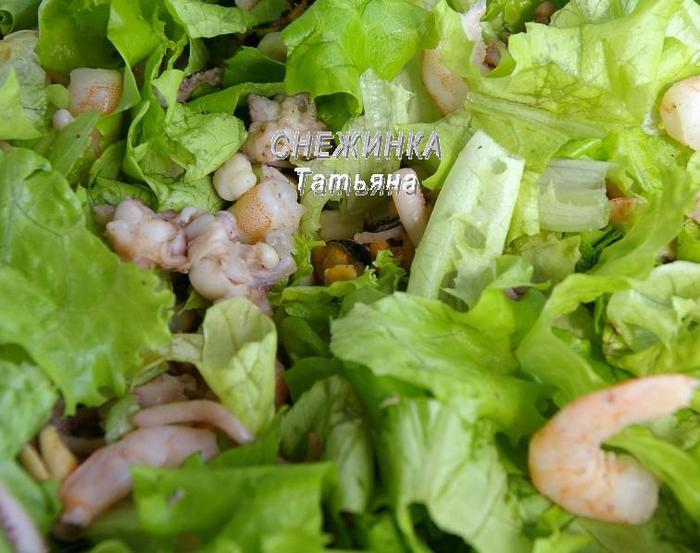 Салат вымойте, обсушите бумажным полотенцем, порвите на крупные кусочки. Морской коктейль разморозьте и подержите на пару буквально минут, или опустите в кипящую воду и сразу же достаньте. Добавляем морской коктейль к салатным листьям.