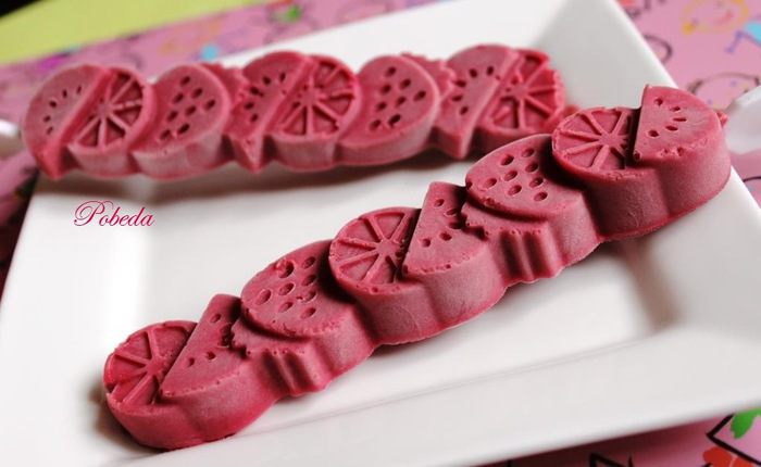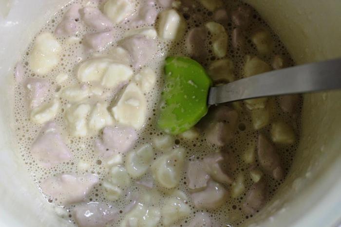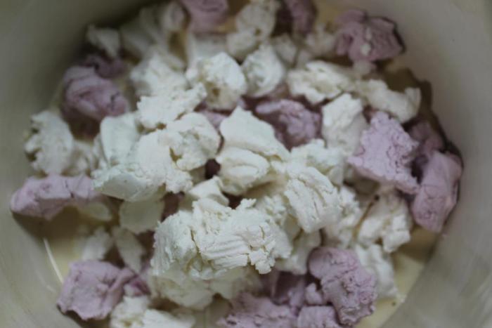 Теперь концентрированное молоко (это то, что в банках, как сгущенка, только более жидкое и несладкое) выливаем в кастрюльку, добавляем к нему обыкновенный зефир (обычно беру просто ванильный, но здесь у меня бело-розовый), разломанный на кусочки. Ставим кастрюльку на огонь и доводим молоко до кипения, постоянно помешивая смесь (лучше силиконовой лопаткой).