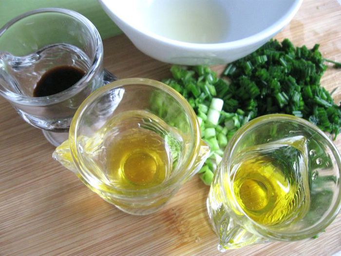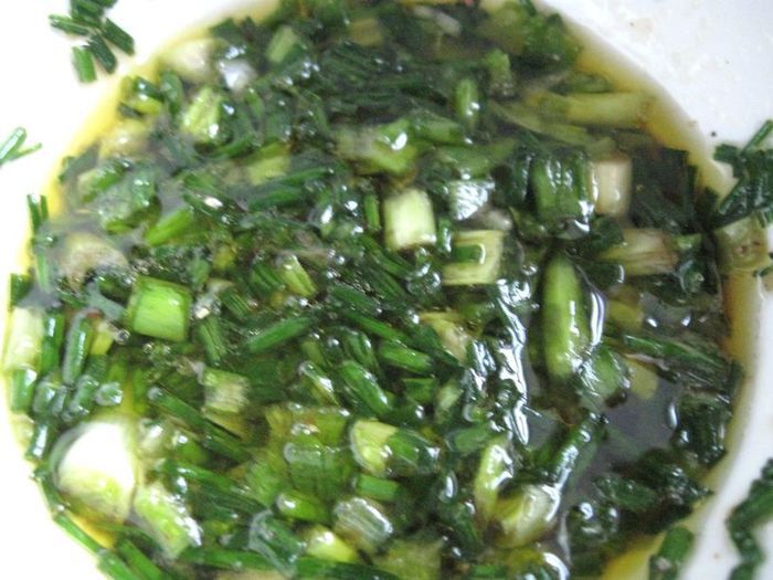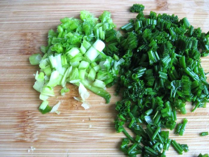 Приготовить соус. Мелко порубить зеленый лук и стебли шнитт-лука.