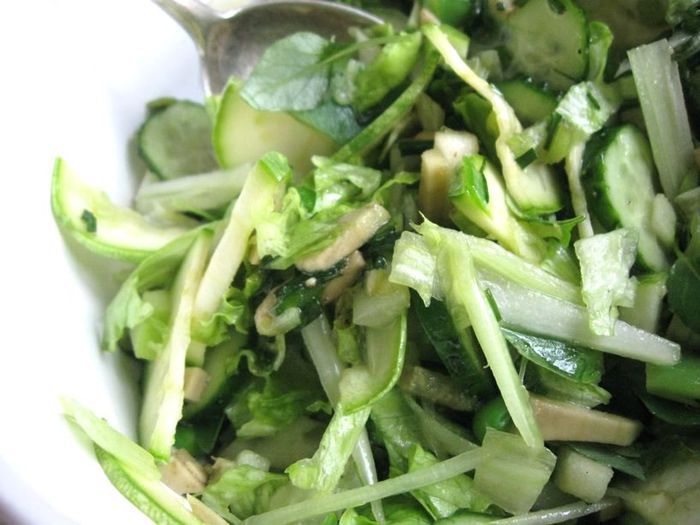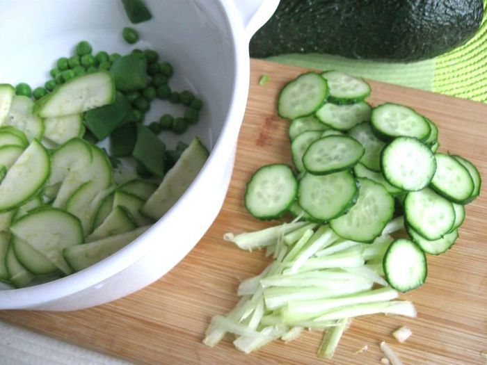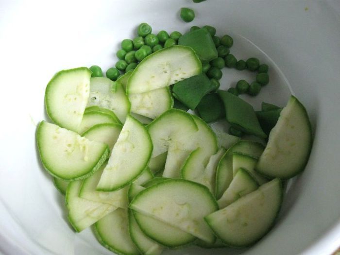 Кабачок нарезать тонкими дольками (молодой кабачок не чистить от шкурки). Смешать с горошком и фасолью в стручках.