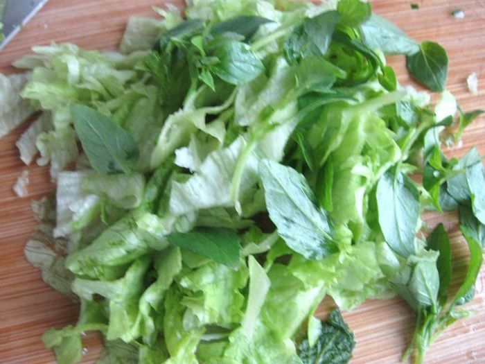 Айсберг, латук и базилик ( 1- 2 небольшие веточки) порезать или порвать руками.