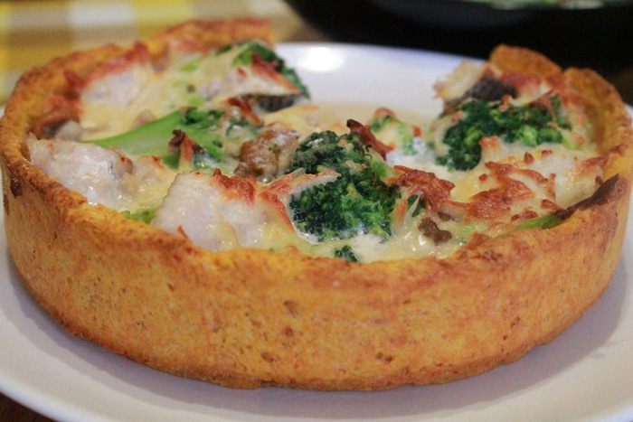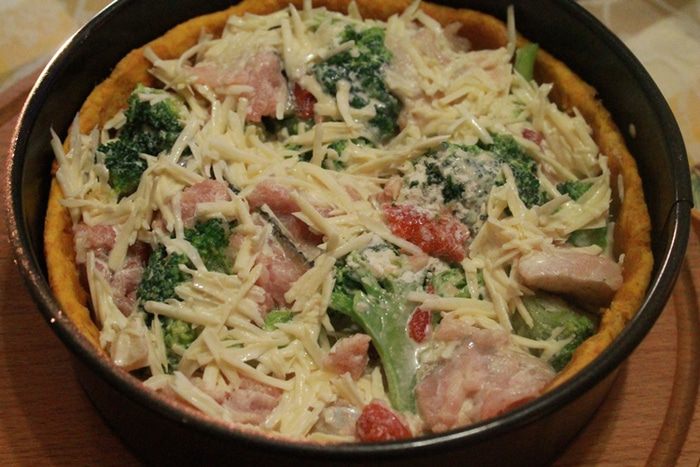 Достать тесто, убрать груз и выложить рыбу и капусту вперемешку. Вылить заливку, равномерно распределяя сыр по начинке.