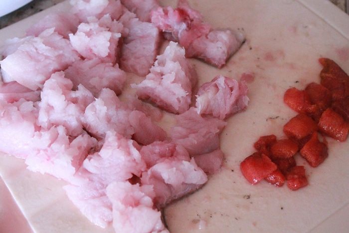 Для начинки рыбу нарезать кусочками, добавить измельченные вяленые помидоры. Смешать в миске сливки, яйцо, горчицу, натертый сыр, чуть присолить.