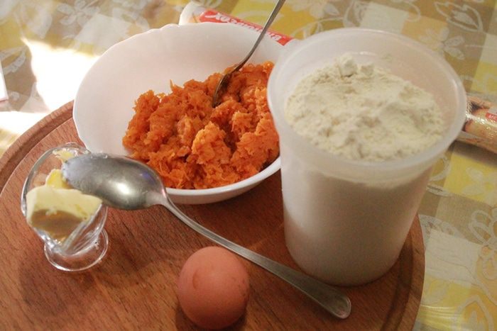 Морковь натереть на самой мелкой терке и положить в комбайн, добавить масло (из холодильника) и муку, соль. Замесить тесто.