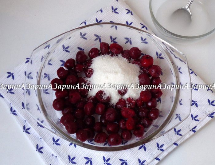 Для соуса крахмал развести холодной водой. Вишню не размораживая засыпать сахаром, перемешать.
