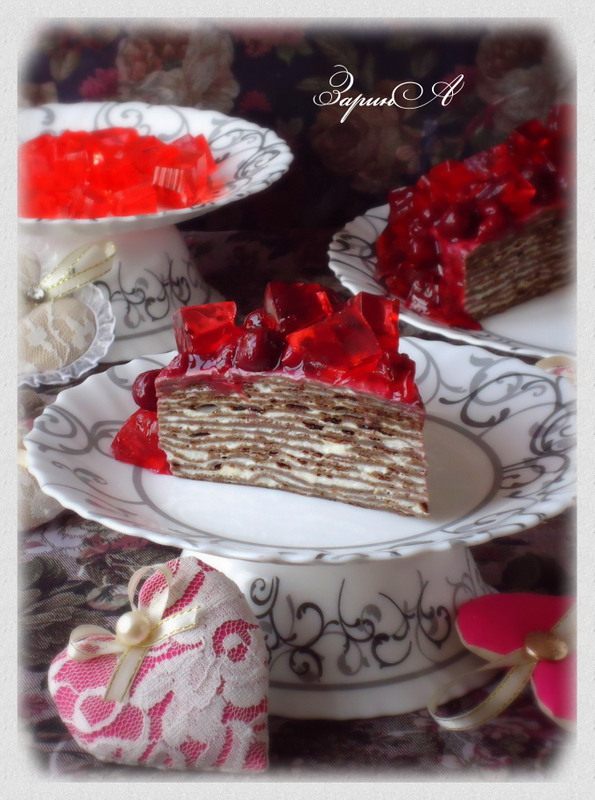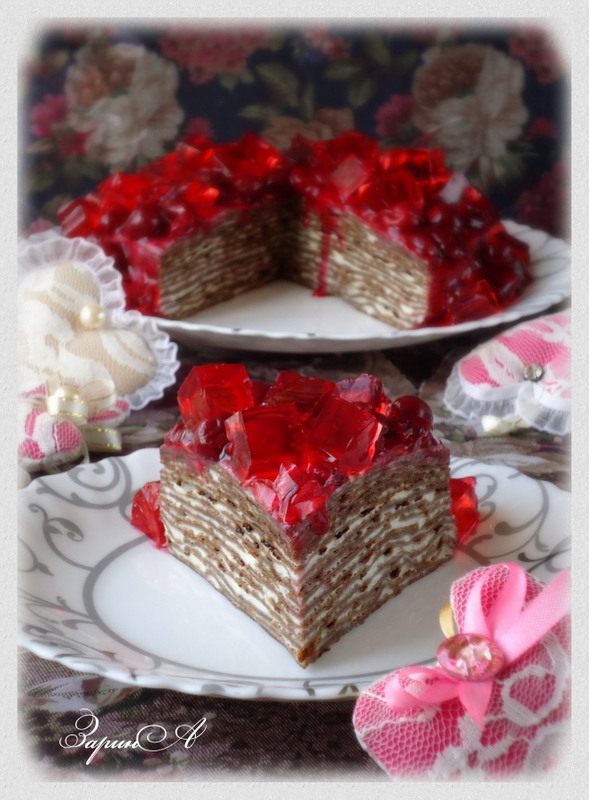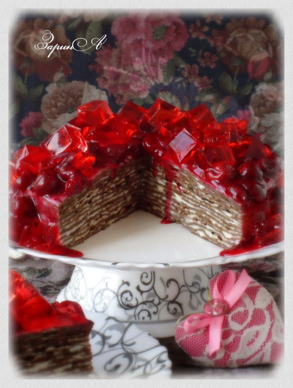Опять любимая черемуха, но уже в блинном тесте. Получился очень вкусный блинный торт. Миндальный вкус черемухи и сливочного крема - великолепный тандем. А кислинка вишневого соуса, только подчеркивает всю прелесть десерта. А чтобы торт смотрелся красивее, украсьте его кубиками из вишневого желе - они так похожи на рубины!