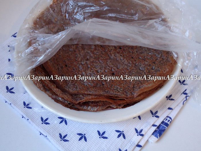 На разогретой сковороде выпечь блины с двух сторон. Пока пекутся блины, уже готовые складывать стопкой и накрывать пленкой, чтобы края не засохли.