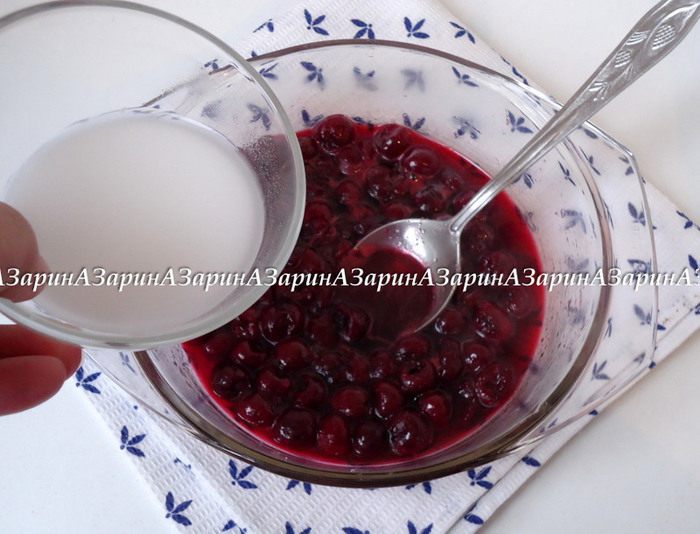 Поставить кастрюльку с вишней на огонь и припустить до мягкости. В горячую вишню влить разведенный крахмал, интенсивно размешивая. Соус вернуть на огонь, довести до загустения и остудить.