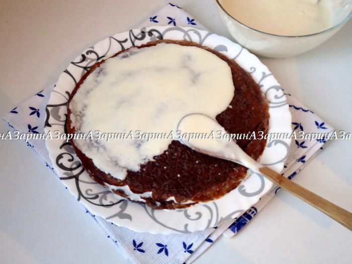 Затем прослоить черемуховые блины сливочным кремом. Торт убрать в холод до полного застывания крема.