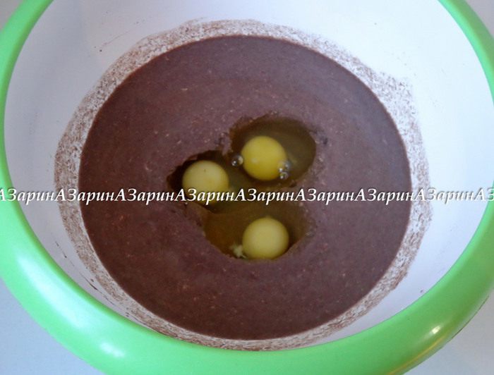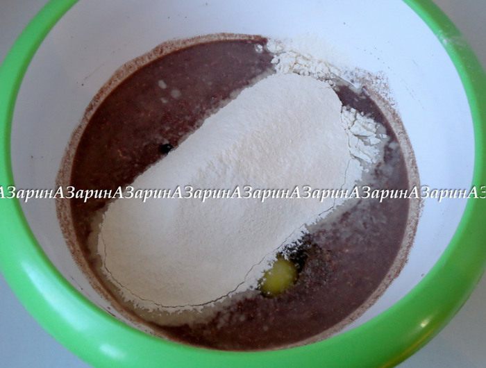 Пшеничную муку просеять в миску с жидкими ингредиентами.