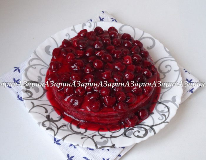 Застывший торт полить вишневым соусом и подать к столу.