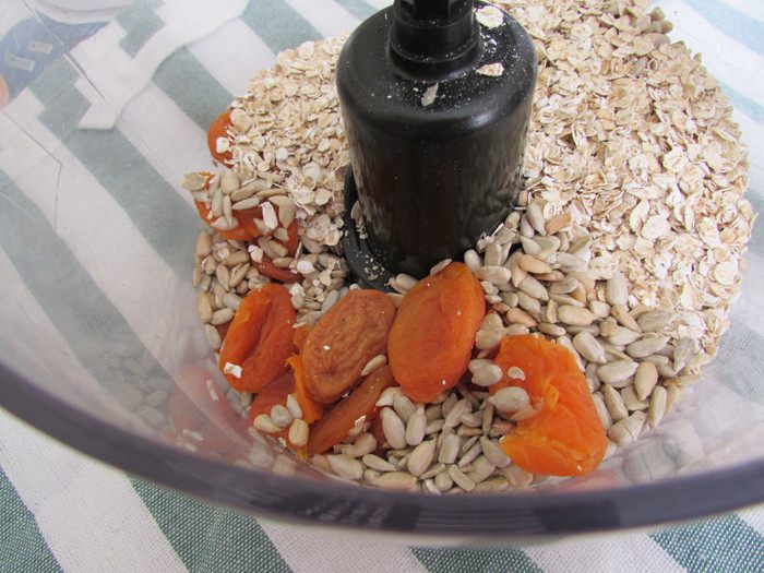В чашу блендера выложить семечки, овсяные хлопья, курагу. Добавьте лимонный сок и все пробейте до однородной массы.