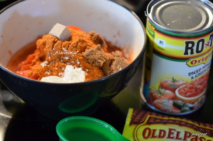 В емкости смешать остальные ингредиенты: специя Тако упаковка, помидоры баночные, кубик бульонный поломанный, сахар коричневый, перец чили или халапеньо перец очистить от семян и порезать тонко.
