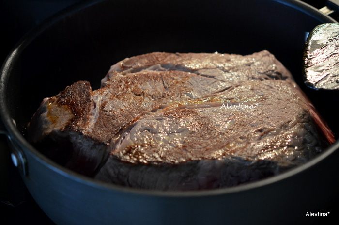 На сковороде или в кастрюле с толстым дном обжарить на растительном масле кусок говядины шейная часть с 2-ух сторон по 3 минуты сторона.