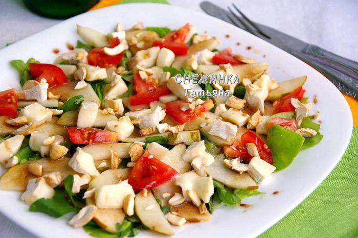 Грушу, сочную и сладкую, нарезаем пластинами и сбрызгиваем соком лимона. Крупный помидор нарезаем небольшими дольками, сыр – кубиками. Орехи кешью можно предварительно обжарить для усиления вкуса, затем ломаем руками половинки орехов на крупные кусочки.