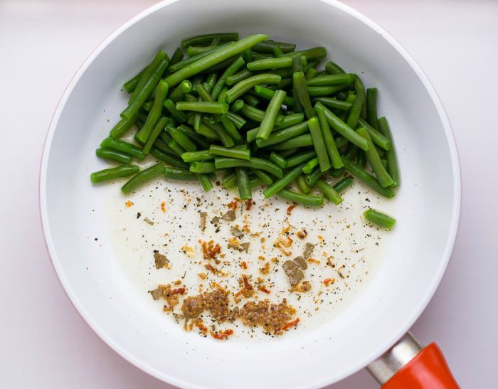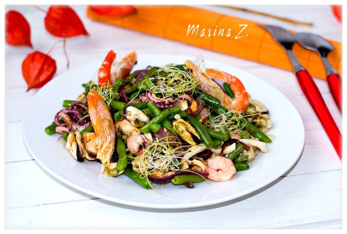 В прогретую сковороду налить растительное масло, добавить овощную соль, дижонскую горчицу, лавровый лист, мед. Дать прогреться, чтобы специи отдали маслу вкус и запах. Лавровый лист вынуть. В сковороду выложить нарезанный полукольцами лук, спассеровать в течение 2 минут. Добавить морской коктейль, немного потушить. Добавить стручковую фасоль, брокколи. Поперчить, перемешать и прогреть минуты 2-3. При необходимости подсолить.