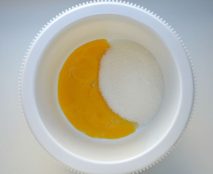 Желтки растереть с 200 г сахара.