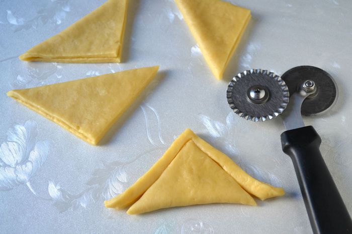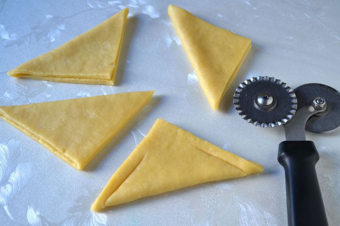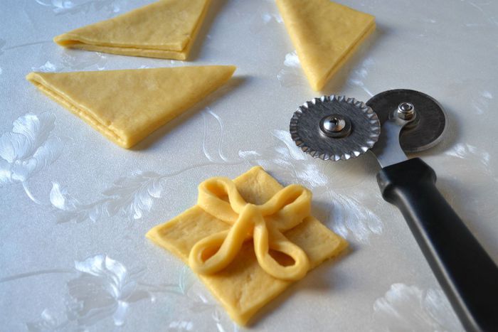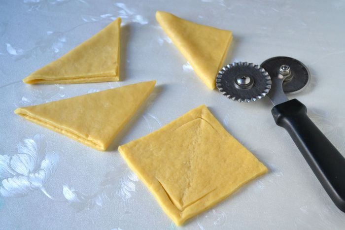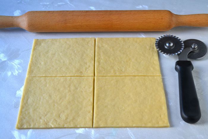 Раскатать тесть в прямоугольник толщиной примерно 1 см, разрезать на квадраты.