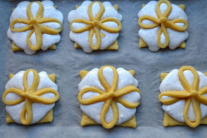 Выложить подготовленные квадраты на противень, застеленный бумагой.