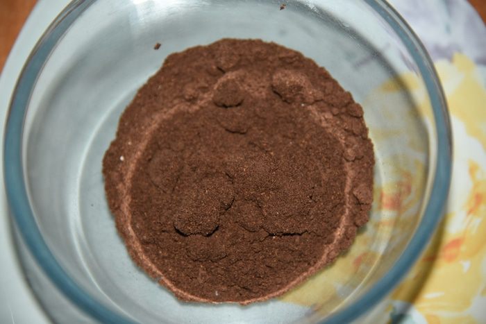Включить разогреваться духовку до 180 градусов. Металлическую форму для кекса смазать маслом и присыпать мукой, силиконовая форма в этом не нуждается. У черемуховой муки чудесный шоколадный цвет – вот такой.