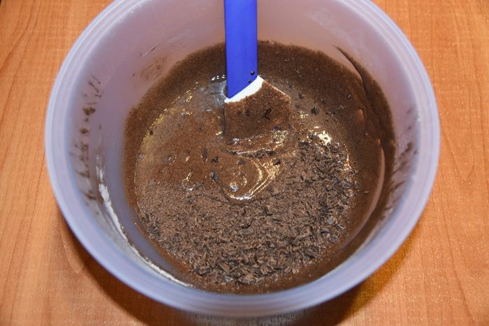 Вмешать просеянную муку с разрыхлителем. Добавить порубленный горький шоколад. Хорошо размешать.