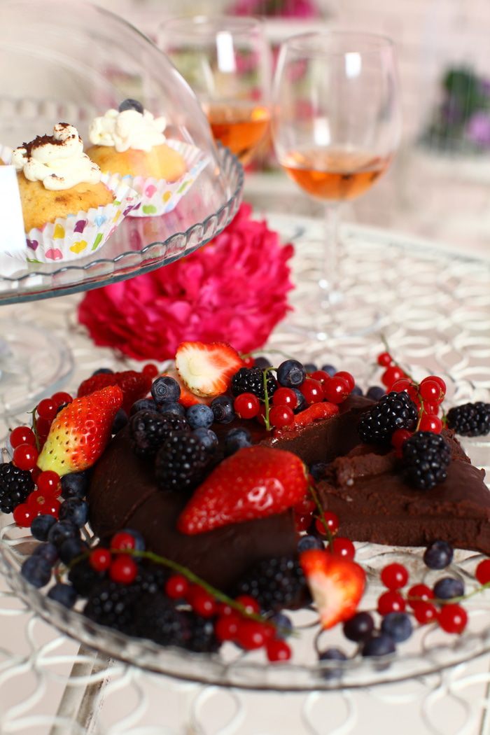 Возьмите разъемную форму (диаметром 20 см и предварительно выстелите ее дно бумагой для выпечки), вылейте в форму шоколадную массу, украсьте тортик свежими ягодами и поставьте в холодильник на пару часов.