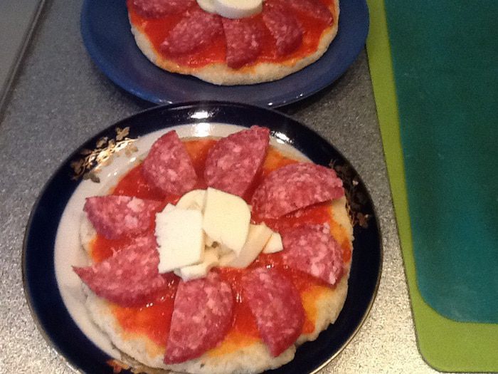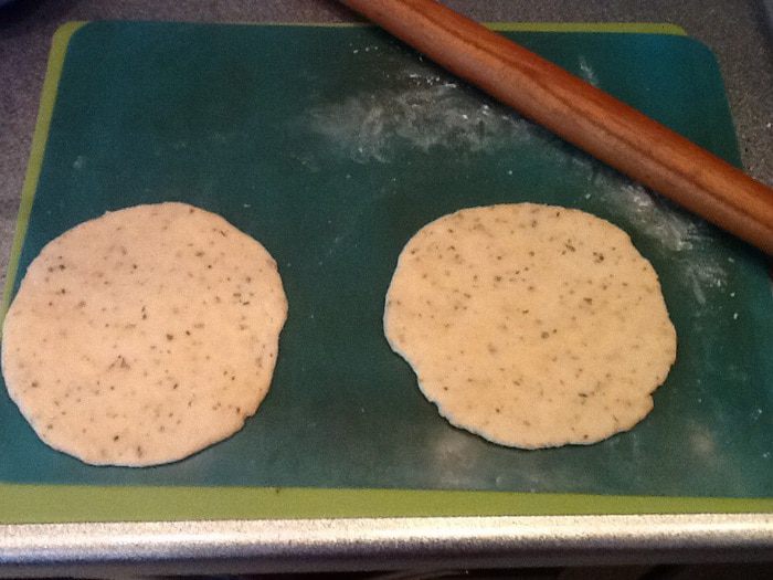 Вымешиваем тесто до однородности, делим на два кусочка и раскатываем основы для пиццы приблизительно 13 см диаметром.