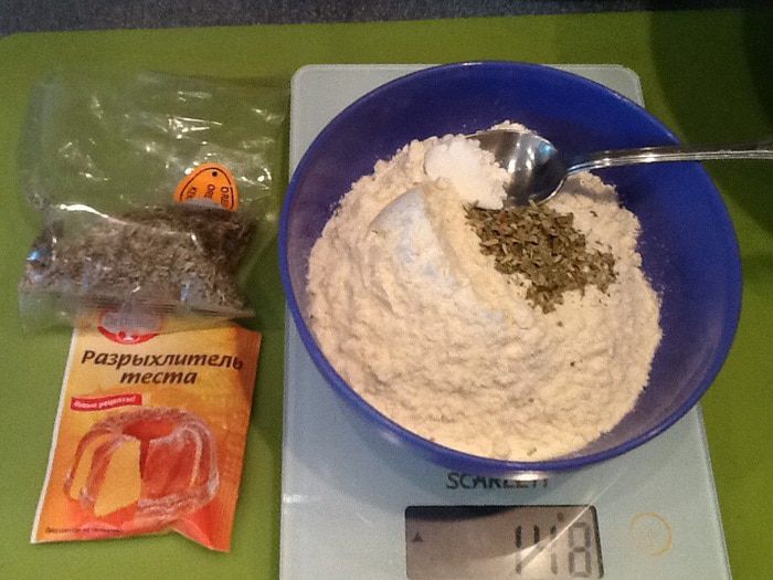 Из муки, воды, соли, масла, разрыхлителя и орегано замешиваем тесто. Если будет очень сухо, добавьте еще немного воды.