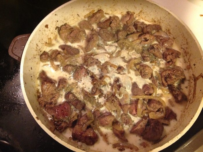 В обжаренную печенку добавить соль, тимьян и влить молоко, огонь убавить и потомить, пока молоко не выпариться на 3/4.