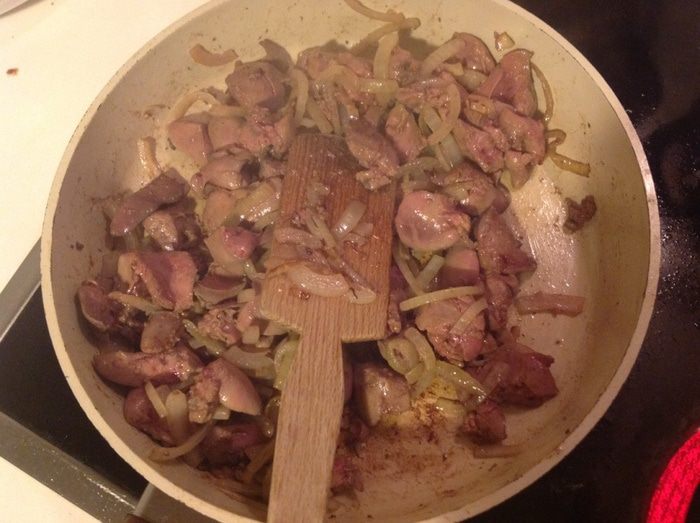 Лук порезать, обжарить до прозрачности. Добавить печень, обжарить до золотистой корочки.