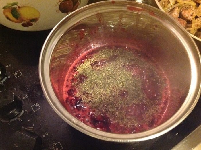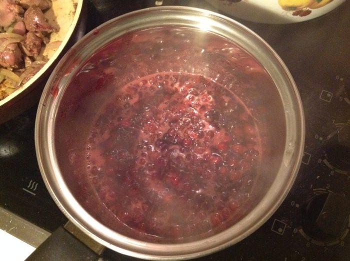 Клюкву засыпать сахаром, добавить воды, довести до кипения, убавить огонь до среднего и дать покипеть, пока обжаривается печень.