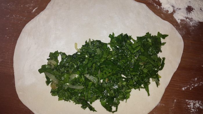 Итак, рубим зелень, смешиваем её с остывшим луком, солим, перчим, добавляем немного оливкового масла, но не слишком много, тщательно перемешиваем. Начинка готова!