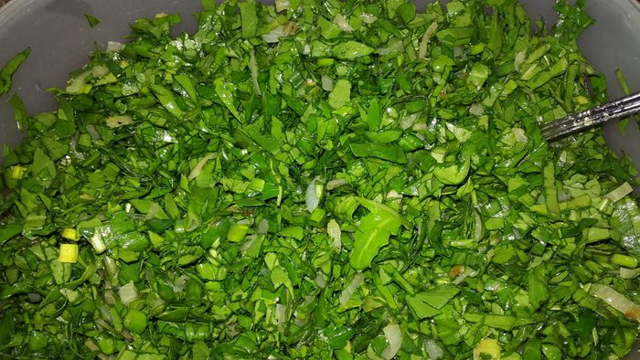 Можно использовать абсолютно любую зелень. Но в качестве основы должна быть нейтральная зелень с не слишком ярко-выраженным ароматом и вкусом. У меня это был шпинат. Подойдет также лебеда, свекольная ботва и крапива. Вообщем все, что сможете найти.